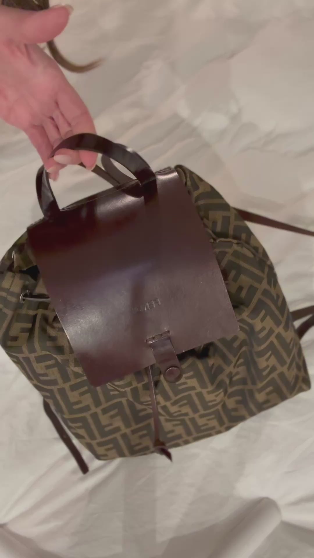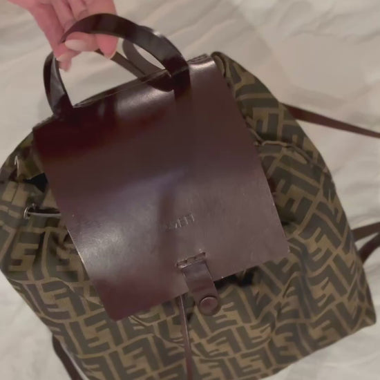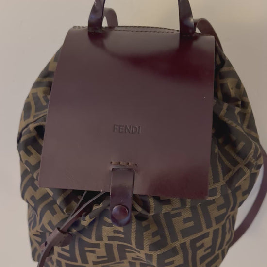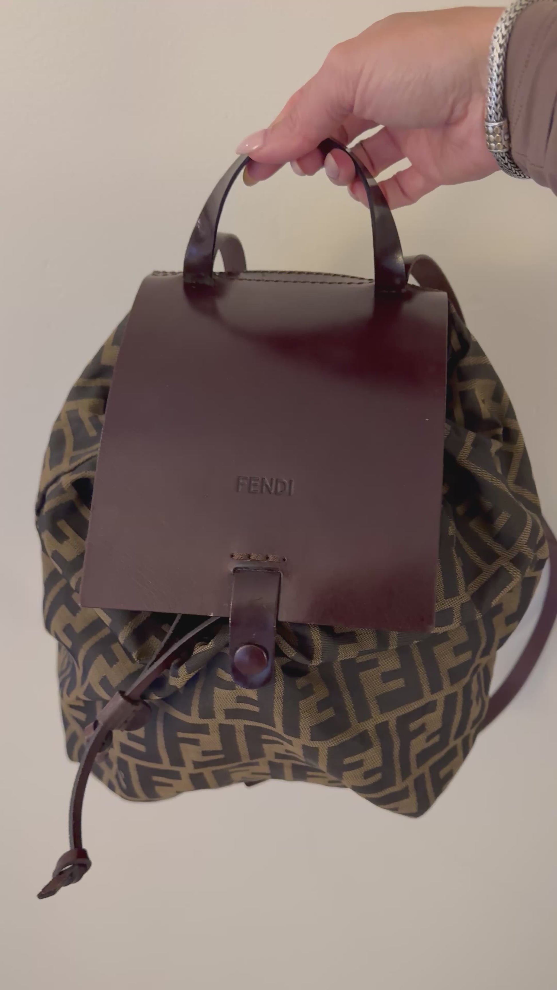 Brown Fendi Zucca Print Canvas. Leather Straps and Flap Closure. Two adjustable shoulder straps. Flap drawstring and Button Closure. Interior zipper pocket. In great vintage condition. Measurements: shoulder straps 13”, top handle drop 3”, height 10.75”, width 9.75”, depth 3.5”